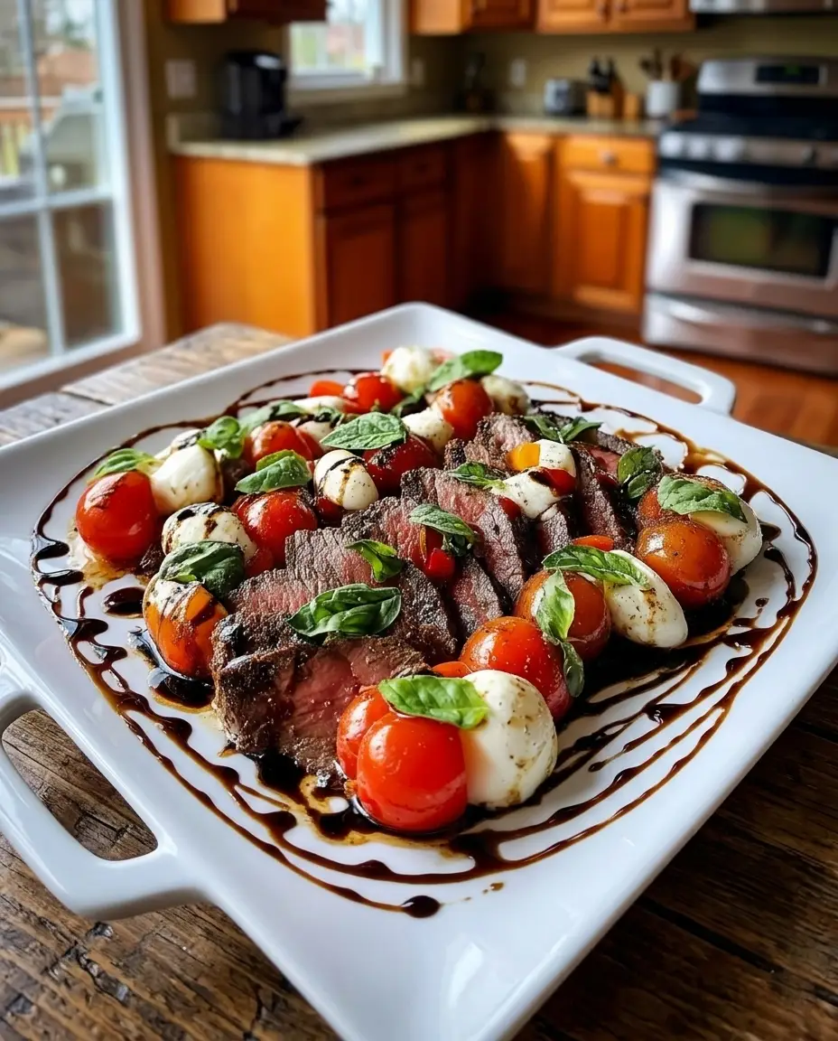 Lay the sliced steak down the center of a large wooden board or white platter and alternate the mozzarella and tomato slices around it for a stunning caprese-style presentation. A final drizzle of good quality balsamic glaze over everything and a generous scatter of fresh basil makes this platter look absolutely restaurant-worthy. Serve alongside warm ciabatta or crusty bread to soak up the juices, and a simple arugula salad with lemon and olive oil for a complete summer dinner that feels both elegant and effortless.